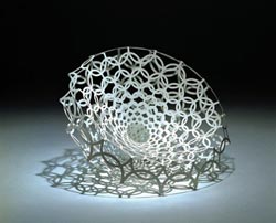 Designmai上有一些不俗的亮點,如Geoffrey Mann的 “趨光(Attracted to Light)” 燈罩。它可以依靠一個光源追蹤一只蛾子的不規(guī)則飛行路線。設(shè)計者通過電影技術(shù)捕捉到昆蟲的螺旋型軌道并依靠快速原型制作技術(shù)制造出實物。