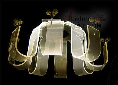 利用加了導(dǎo)光鍍膜的光纖板做成吊燈的造型,配以花邊和花朵做裝飾,營造一種通透精致的美感。光源在中央部位發(fā)散出來的光線通過光纖板均勻有度的散發(fā)到四周,看起來仿佛整個燈體都在發(fā)光,光線與燈體營造出燦若夏花的精致美麗。