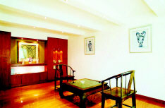 與客廳相連的茶室里用有節(jié)律分布的筒燈來(lái)代替室內(nèi)主射燈,從而使規(guī)則排布的條形假梁閃現(xiàn)出幾分靈動(dòng)的氣息,與棕色木地板、滕椅、方桌相和諧,展示柜的處理極為簡(jiǎn)潔,在櫻桃木的映襯下,幾盞精巧的內(nèi)置燈將主人的愛(ài)物和盤(pán)托出,平和、大度和休閑的氣氛便油然而生。