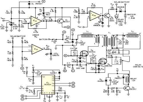 圖1所示太陽能燈電路是一種低損耗電路,使用一只7W四引腳CFL(小型熒光燈)和一塊12V、7-Ahr密封免維護(hù)電池。逆變器的效率大于85%,靜態(tài)電流小于2mA。它有一個帶電池過放電保護(hù)功能和過充電保護(hù)功能的并聯(lián)充電控制器。低靜態(tài)電流、過放電保護(hù)功能和過充電保護(hù)功能三者確保電池使用壽命很長。逆變器的預(yù)熱功能可以避免CFL兩端變黑,從而延長其使用壽命。這一電路可在農(nóng)村地區(qū)用作一種可靠小巧的便攜式光源,在城市用作應(yīng)急燈系統(tǒng)。并聯(lián)充電控制器電路包括IC1(低電流2.5V電壓基準(zhǔn)源LM385)和IC2(LM324比較器)。配有電阻R1 ~ R8和三極管Q1的IC2A可防止電池過放電。
