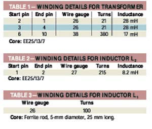 表1、2、3列出了電路中磁性元件的鐵心與繞組的數(shù)據(jù)。逆變器使用一個以MOSFET管為開關(guān)器件的D類推挽外驅(qū)動電路,IC3(SG3524)驅(qū)動這一逆變器。外驅(qū)動結(jié)構(gòu)可以在各種環(huán)境下確保電路無故障起動。