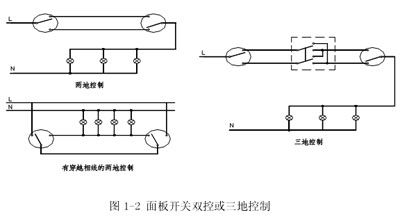 蹺板開關(guān)設(shè)置于門口,對于面積較大的房間燈具較多時(shí),采用雙聯(lián)、三聯(lián)、四聯(lián)開關(guān)或多個(gè)開關(guān),其原理接線圖見圖1-1。