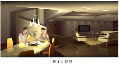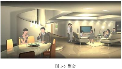 在一定場所或整個(gè)樓宇,用戶預(yù)設(shè)多種場景,按動(dòng)一個(gè)按鍵,即可調(diào)用要的場景。圖1-5至1-8為場景變換狀態(tài)。