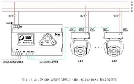HDL-BUS系統(tǒng)為廣州河?xùn)|電子公司生產(chǎn)的智能照明控制系統(tǒng),不僅有上述功能,該系統(tǒng)采用開放性及高擴(kuò)展性協(xié)議,能使照明系統(tǒng)與樓宇控制系統(tǒng)、消防系統(tǒng)、保安系統(tǒng)、舞臺燈光系統(tǒng)等實(shí)現(xiàn)無縫聯(lián)接。其接線示意圖見 1-11、1-12、1-13。