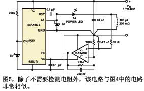 圖4和5中的電路在8V至50V的電壓下工作。假如有一個12V的系統(tǒng),其中所有的元件都確定了,由于IC輸入電源端子VIN有76V的絕對最大額定電壓,這種電路可以承受負載卸出。最大可用電流為1A,只要將工作電壓的下限值提高到11.5V,電路就可以驅(qū)動三個串接的LED。兩個電路非常相似,只是圖5中的電路使用電感電阻作為電流傳感器。由于銅電阻率具有較大的溫度系數(shù),使用電感電阻的缺點是輸出電流依賴溫度。電感繞組由銅制成,其直流電阻有3.9parts/1000/°C的一階溫度系數(shù)。結(jié)果是在工作溫度范圍內(nèi),溫度每增加10°C,調(diào)節(jié)的電流就會下降4%。