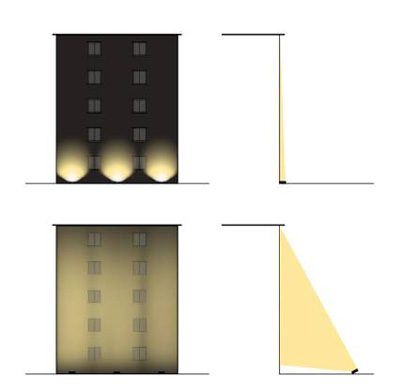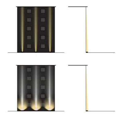 普通泛光燈安裝在墻面上,對(duì)于整個(gè)建筑,由于光線難以送達(dá)建筑上部,形成很強(qiáng)烈的明暗對(duì)比,為了使光線延伸到建筑頂部,加大燈具功率又容易形成“高光亮點(diǎn)”。