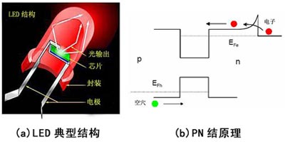 發(fā)光二極管(LED)是一種能把電能轉(zhuǎn)化為光能的固體器件,它的結(jié)構(gòu)主要由PN結(jié)芯片、電極和光學(xué)系統(tǒng)等組成。LED的基本的工作原理是一個(gè)電光轉(zhuǎn)換過程,當(dāng)一個(gè)正向偏壓施加于PN結(jié)兩端,由于PN結(jié)勢壘的降低,P區(qū)的正電荷將向N區(qū)擴(kuò)散,N區(qū)的電子也向P區(qū)擴(kuò)散,同時(shí)在兩個(gè)區(qū)域形成非平衡電荷的積累。由于電流注入產(chǎn)生的少數(shù)載流子是不穩(wěn)定的,對于PN結(jié)系統(tǒng),注入到價(jià)帶中的非平衡空穴要與導(dǎo)帶中的電子復(fù)合,其中多余的能量將以光的形式向外輻射,電子和空穴的能量差越大,產(chǎn)生的光子的能量就越高。能量級差大小不同,產(chǎn)生光的頻率和波長就不同,相應(yīng)的光的顏色就不同。