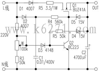 電路中R5是限流電阻,可減小對C2充電電流的峰值。穩(wěn)壓管D5是為了防止Q1因柵極電壓過高損壞而設(shè)。D4用作輸出保護,當C2兩端電壓過高時D4、Q2導(dǎo)通,使Q1截止。因在市電的負半周時電路不工作,為了加大輸出電流,可在輸入端加接一整流橋,使市電的正負半周都能得到利用,這樣可使輸出電流增加80mA,同時還能改善輸出電壓的平滑度。在實際應(yīng)用時可將電位器W、R3用一個固定電阻代替。在輸出電壓穩(wěn)定度要求高時,可加接三端穩(wěn)壓IC。