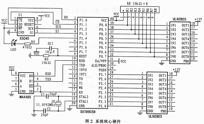 燈控箱系統(tǒng)的核心硬件圖如圖2所示,以SST89C58型單片機(jī)為核心,用P0口和P2口進(jìn)行信號控制,注意P0口要加上拉電阻器。通過2個ULN2803進(jìn)行電流放大,可驅(qū)動16路繼電器。由于片內(nèi)帶有共陰極箝位二極管,可適應(yīng)感性負(fù)載,故輸出端可省去大量二極管。SST89C58驅(qū)動16路繼電器,可控制16路燈信號。若要增加控制信號,可增加8255型器件擴(kuò)展并行接口。用X5045保存RS-485網(wǎng)絡(luò)從機(jī)站號。SST89C58單片機(jī)的P1.2引腳用來模擬X5045的時鐘輸入信號SCK,CS=0時,串行輸出SO在時鐘信號下降沿有效,串行輸入SI在上升沿有效(WP=1)。具體操作還需要寫入狀態(tài)字。串口部分選用MAX485。其中,RE與DE接在一起由單片機(jī)的RD(P3.7)控制。拉低為接收有效,拉高為發(fā)送有效。該系統(tǒng)還具有上電自動復(fù)位和通電指示功能。設(shè)計(jì)PCB時應(yīng)注意合理布線,對單片機(jī)電源進(jìn)行濾波整流,并遠(yuǎn)離干擾源。