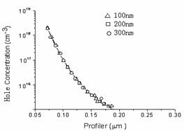 我們主要關(guān)心的還是表面附近載流子的濃度。圖5為樣品表面附近空穴濃度和激光輻照時(shí)間的關(guān)系。從圖中可以看到隨著輻照時(shí)間的增加,表面附近的空穴濃度也增加,這可能是由于輻照時(shí)間較長時(shí)Zn摻入的濃度較大的原因。樣品表面附近的空穴濃度都在3×1018cm-3以上,最大約為5.8×1018cm-3。當(dāng)然對(duì)于具有器件結(jié)構(gòu)的材料來說并不是輻照時(shí)間越長摻雜效果越好,除了考慮到樣品不允許破裂之外,還有一個(gè)重要的限制就是不能因摻雜的深度太深而破壞器件的結(jié)構(gòu)。為了應(yīng)用到光電器件的制備,對(duì)于激光參數(shù)需要很多的優(yōu)化選擇。
