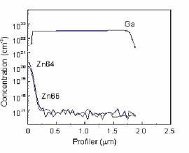 為了研究Zn層的厚度對(duì)摻雜濃度和深度的影響,取三個(gè)未摻雜顯n型的GaN樣品沉積不同厚度的Zn膜,分別為100nm、200nm、300nm。利用脈沖寬度為1.0ms的脈沖激光輻照樣品,輻照時(shí)間為2s。激光誘導(dǎo)摻雜完成后首先用稀HCl腐蝕掉樣品表面殘留的物質(zhì)。利用熱探針的方法測量樣品的p、n屬性,結(jié)果表明樣品的導(dǎo)電類型都為p型,說明激光誘導(dǎo)摻雜的方法成功地使得樣品發(fā)生了由n型向p型的轉(zhuǎn)變,利用電化學(xué)C-V方法進(jìn)行測量的結(jié)果也證實(shí)了這一點(diǎn)。圖1是我們用電化學(xué)C-V方法測量不同Zn薄膜厚度同樣摻雜方法的樣品所得到的空穴濃度分布圖。從圖1可以看到在接近樣品表面處空穴濃度最大達(dá)3×1018cm-3,然后空穴濃度隨深度的增加而按指數(shù)形式減少符合余誤差分布,100nm~300nm不同Zn厚度對(duì)摻雜的效果沒有影響,這可能是由于Zn的導(dǎo)熱性能很好,小范圍的厚度變化對(duì)于吸收激光后Zn/GaN界面的升溫沒有明顯影響。為了研究激光誘導(dǎo)摻雜樣品中摻入的Zn原子的分布情況,我們對(duì)另外一些試驗(yàn)條件的樣品進(jìn)行了SIMS(二次離子質(zhì)譜)分析。圖2是我們用脈沖寬度為1.5ms的Nd:YAG 輻照表面濺射Zn金屬薄膜的GaN樣品 ,用SIMS(二次離子質(zhì)譜)方法所測量該樣品中Zn64和Zn66(鋅的兩種同位素)的分布圖。從此圖可以看到在樣品表面Zn原子的濃度最大約5.63×1020cm-3,Zn原子的濃度隨深度的增加而按指數(shù)形式減少,也符合余誤差分布。從Zn在GaN樣品中的分布來看,激光誘導(dǎo)摻雜的分布和熱擴(kuò)散的分布比較類似。因此,我們推測GaN表面激光誘導(dǎo)Zn摻雜的機(jī)理可能是Zn的熱擴(kuò)散。當(dāng)然影響激光誘導(dǎo)摻雜可能還有其他的一些因素,例如強(qiáng)激光照射金屬薄膜表面時(shí)可能會(huì)產(chǎn)生等離子體,從而引起等離子滲擴(kuò)效應(yīng)等等,這需要更多的理論和試驗(yàn)來證實(shí)。