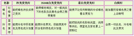住宅裝修設(shè)計的基調(diào)應(yīng)以溫、冷色為主。但光源對顏色是具有影響的,住宅室內(nèi)照明按上述原則,大量采用的白熾燈、 熒光燈光源也不例外?,F(xiàn)把熒光燈。白熾燈對冷色與暖色的影響列表如表2。