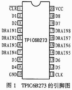 TPIC6B273是美國TI公司生產(chǎn)的一種8通道D型觸發(fā)器鎖存、功率輸出新型器件,該器件集8位數(shù)據(jù)鎖存、驅(qū)動(dòng)輸出控制為一體。