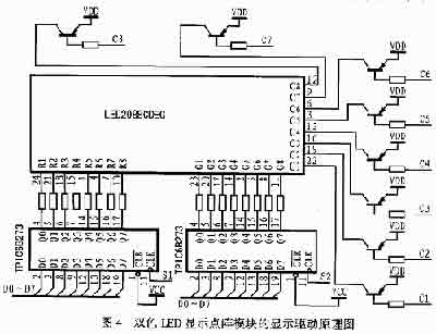 紅、綠雙色LED顯示點(diǎn)陣模塊在同一點(diǎn)陣顯示窗內(nèi)共同封裝了紅、綠各一個(gè)LED顯示元件。因此,每一個(gè)點(diǎn)均可實(shí)現(xiàn)紅、綠、橙(紅色、綠色LED同時(shí)點(diǎn)亮?xí)r)三色的顯示。當(dāng)以占空比的方式控制顯示亮度時(shí),還可以實(shí)現(xiàn)灰度變化。圖4是雙色LED顯示點(diǎn)陣模塊的顯示驅(qū)動(dòng)原理圖。若采用共陽形式雙色LED顯示模塊,那么雙色LED顯示點(diǎn)陣模塊將有8路共陽行向驅(qū)動(dòng)引線以及紅、綠各8路列向灌電流驅(qū)動(dòng)引線。這樣,通過對行方向各晶體管的控制便可為顯示模塊內(nèi)的紅、綠兩色LED提供動(dòng)態(tài)驅(qū)動(dòng)電流。兩個(gè)TPIC6B273則分別控制紅、綠色LED的列方向顯示。因此,對兩個(gè)TPIC6B273的適當(dāng)選通并鎖存特定的數(shù)據(jù),便可對每一個(gè)紅、綠雙色LED顯示模塊上的顯示點(diǎn)實(shí)現(xiàn)紅、綠、橙或無色4種狀態(tài)的顯示控制。