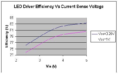 圖3:LED驅(qū)動器效率顯示了電流檢測電阻器損耗的重要性
