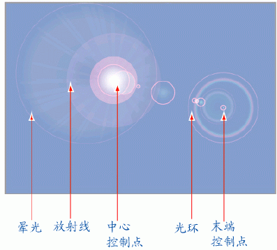 起初我還以為眩光工具只是Photoshop中鏡頭光暈濾鏡的翻版,其實(shí)不然。此工具是應(yīng)用在矢量圖形上的,因此不必導(dǎo)入Photoshop中就能做出漂亮的眩光效果:燦爛陽光,鏡頭光暈,珠光寶氣……均可得到精彩呈現(xiàn)。下面我們們先從基本的學(xué)起,來看看眩光的基本組成和相關(guān)屬性,眩光的具體組成如圖1所示。