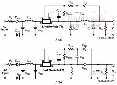 圖1所示為配置為基本降壓式轉(zhuǎn)換器(圖1a)和基本升降壓式轉(zhuǎn)換器(圖1b)的LinkSwitch-TN器件。通過在單片IC上集成一個功率MOSFET、振蕩器、簡單的開/關(guān)控制、一個高壓開關(guān)電流源、頻率抖動、逐周期電流限流及熱關(guān)斷電路,可以簡化轉(zhuǎn)換器階段的設(shè)計復(fù)雜度并減少元件數(shù)。LinkSwitch-TN器件可通過漏極引腳實現(xiàn)自供電,無需使用偏置電源及相關(guān)電路。它極具成本效益,可用來替代輸出電流小于或等于360mA的線性和電容降壓式非隔離電源,因此能夠提供出色的輸入電壓調(diào)整率和負(fù)載調(diào)整率。與無源元件電源方案相比,它的效率更高,而功率因子則比電容降壓式方案高。