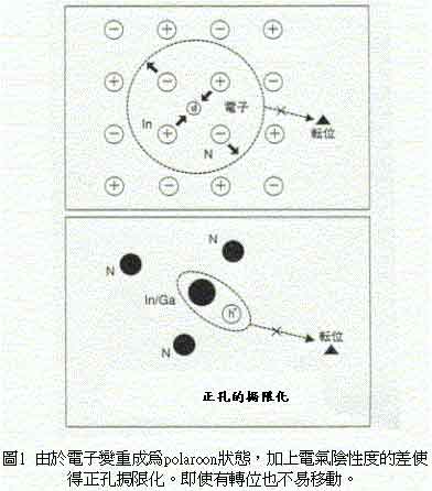 另一方面正孔也形成polaroon自我束縛狀,加上In原子與Ga原子的電氣陰性度的差,尤其是In原子周?chē)叹嚯x型電位(potential),有可能產(chǎn)生強(qiáng)大的正孔捕捉。類(lèi)似上述的電子與正孔的挶限化,會(huì)在奈米以下的原子大小范圍內(nèi)產(chǎn)生,這種現(xiàn)象可視為InGaN化合物半導(dǎo)體的固有性質(zhì),換句話(huà)說(shuō)注入發(fā)光組件活性層的載子,由于上述的捕捉效應(yīng)被空間性的挶限,到達(dá)「發(fā)光殺手(killer)中心」的比率則相對(duì)的偏低,所以即使InGaN/GaN等化合物半導(dǎo)體具有大量的轉(zhuǎn)位格子缺陷,仍舊可作高效率的發(fā)光。
