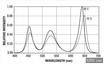 (圖二) RGB LED輸出光譜受溫度影響偏移的范例