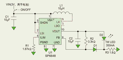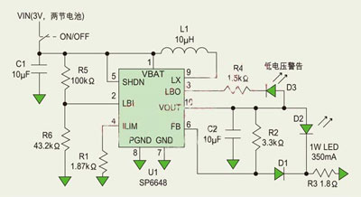 大功率LED用于照明是本世紀(jì)的新課題,其節(jié)能、安全、使用壽命長(zhǎng)的綜合優(yōu)點(diǎn)將引發(fā)新一輪照明革命。在需要用電池供電的LED手電筒應(yīng)用中,如何在使用相同電池的前提下,延長(zhǎng)電池的使用時(shí)間呢?這就涉及到電源管理問題。本文就目前較流行的幾種SP6648EU驅(qū)動(dòng)電路,介紹手電筒LED照明電路的設(shè)計(jì)考慮因素。
