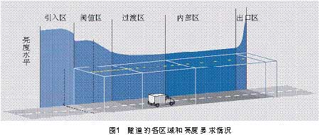 在CIE中規(guī)定隧道內(nèi)需要的光線由隧道外面光線的亮度和該點(diǎn)在隧道中的位置決定(CIE88-1990)。在設(shè)計(jì)隧道照明時(shí)需考慮5個(gè)區(qū)域的情況(如圖1所示):