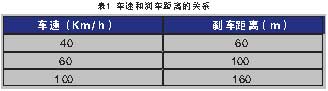 上圖的剎車距離是發(fā)現(xiàn)障礙物到剎車停止的距離,通常與車速有關(guān),具體數(shù)據(jù)如表1所示。