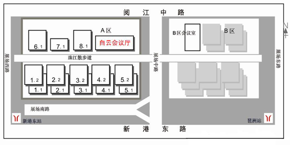 乘坐地鐵一號線 / 三號線 / 四號線,可于公園前站 / 客村站 / 萬勝圍站轉(zhuǎn)乘地鐵二號線,在新港東站下車,從A出口步行約三分鐘即達展館。