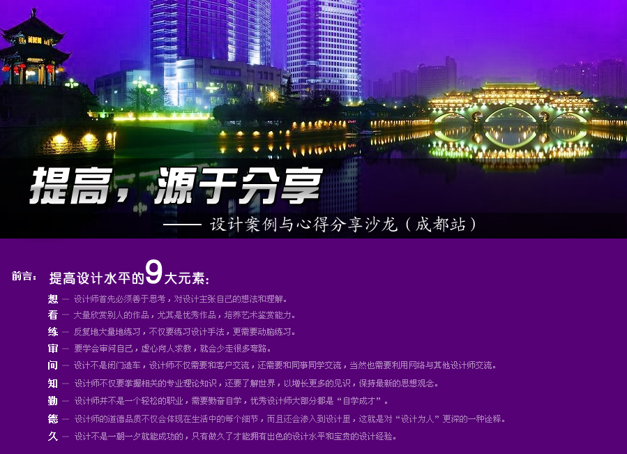 為建立設(shè)計(jì)師面對(duì)面交流學(xué)習(xí)的平臺(tái),協(xié)助設(shè)計(jì)師提高設(shè)計(jì)水平,阿拉丁照明網(wǎng)將在成都舉辦設(shè)計(jì)案例與心得分享沙龍,誠(chéng)邀各大設(shè)計(jì)師共同參與!