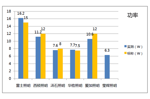 此次6款樣品中,愛加照明實(shí)測(cè)功率低于標(biāo)稱功率11.67%,瑩輝照明未標(biāo)稱產(chǎn)品功率,其他4款產(chǎn)品的實(shí)測(cè)功率與標(biāo)稱功率浮動(dòng)值相對(duì)較小,其中西頓照明、湯石照明與華格照明在功率的控制上相比其他更為精準(zhǔn)。