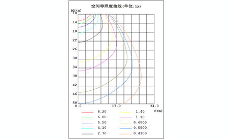 從上圖可看出,燈具發(fā)光為軸對(duì)稱(chēng)配光,C0/180面為92.2度,C90/270面為105.3度,平均光束角為98.8度,從配光曲線(xiàn)圖看,此燈具應(yīng)該是兩邊發(fā)光,光源安裝在C90/270縱向方向燈具邊上;C90/270面曲線(xiàn)較為平整,說(shuō)明導(dǎo)光板能充分導(dǎo)光,發(fā)光面較為均勻;結(jié)合空間等照度曲線(xiàn),考察的是該燈具下10m到50m,距離34m的截面(C0平面)的照度分布情況。.... [詳細(xì)]