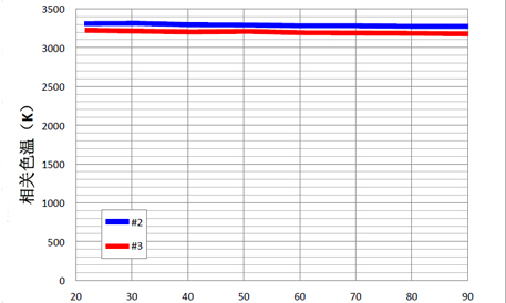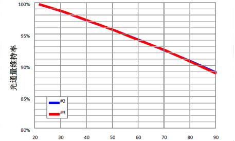 從圖 4~圖 6 結(jié)果看來(lái),從 20℃到 90℃的溫度變化下,光通量衰減了 11%左右,衰減率約為 0.16%/℃,相關(guān)色溫變化在 50K 以內(nèi),色坐標(biāo) x 變化 在 0.001 以內(nèi),色坐標(biāo) y 變化在 0.006 以內(nèi)...... [詳細(xì)]