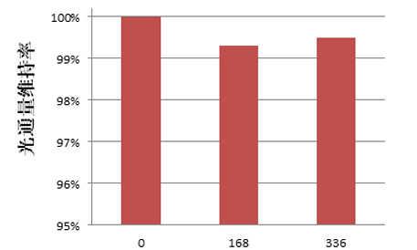 老化條件為 85℃&85%RH,老化過(guò)程中樣品以 540mA 電流點(diǎn)亮,分別 在 0h、168h 和 336h 進(jìn)行光色電性能測(cè)試,其光通量維持率如圖 7 所示。