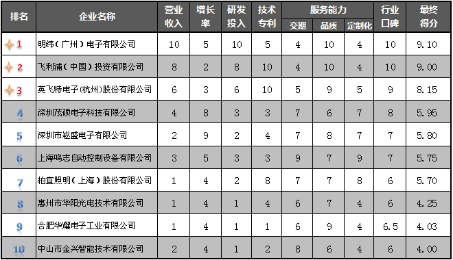 1. 營業(yè)額、增長率、研發(fā)投入、技術(shù)專利是以實際數(shù)據(jù)為基礎(chǔ)的區(qū)間打分,服務(wù)能力和行業(yè)口碑是根據(jù)100家下游大功率LED電源應(yīng)用企業(yè)的問卷調(diào)查數(shù)據(jù)綜合打分所得;
