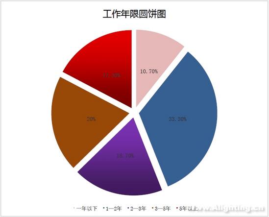 從工作年限來看,此次受訪者工作年限分布較為平均,其中1-2年的占比最多,為33.3%。另外,工作時(shí)間在三年內(nèi)的工程師占了大部分,而工作年限在5年以上的僅占17.3%。由此也反映出目前照明行業(yè)內(nèi)缺少資深級(jí)別的工程師,這也是照明業(yè)內(nèi)普遍缺少技術(shù)創(chuàng)新的重要原因之一,若要?jiǎng)?chuàng)新還需建立在一定的行業(yè)積累上。