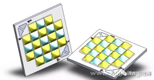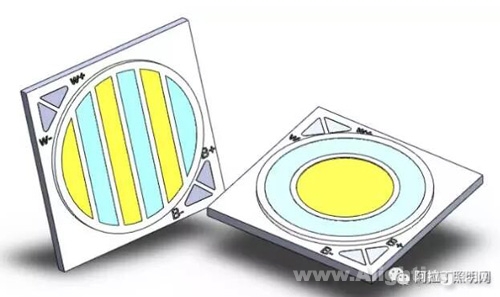 可調(diào)色COB光源通常是由兩種或以上不同顏色芯片線路組成,分別調(diào)控兩組顏色亮度比例,通過混光來實(shí)現(xiàn)整個(gè)COB光源出光顏色的變化,其技術(shù)難點(diǎn)是混光效果。早期類似結(jié)構(gòu)的COB光源很多,只是遠(yuǎn)沒有達(dá)到商業(yè)照明要求而無法應(yīng)用。