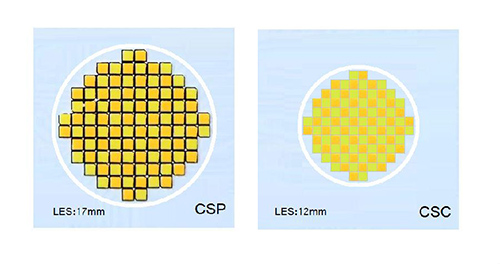 比喻形象,還需數(shù)據(jù)佐證。在采用相同尺寸晶片、功率(數(shù)量)相同的前提下,我們來看看CSP與CSC實(shí)際應(yīng)用的區(qū)別。