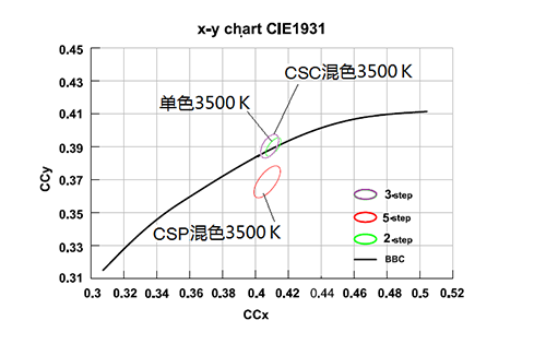 【PK結(jié)果】CSP結(jié)構(gòu)難以實(shí)現(xiàn)好的混光品質(zhì),CSC結(jié)構(gòu)可以實(shí)現(xiàn)接近單色COB的光色品質(zhì)。