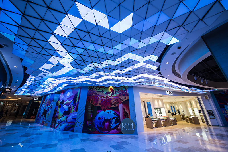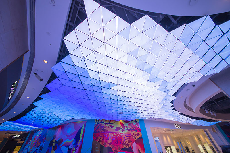 整個藝術(shù)作品是由1,500 塊等大的三角形燈片構(gòu)成,每個燈片的傾斜角度及離地高度不同,3 米寬、31 米長如海浪般的曲線造型懸掛在天花板上。流動的波浪中安裝著可以變換1,680 萬種顏色和圖案的LED 燈光設(shè)備,所有顏色的變化與效果可通過計算機(jī)程序控制,通過改變每一個燈片的顏色組成各種形態(tài)。