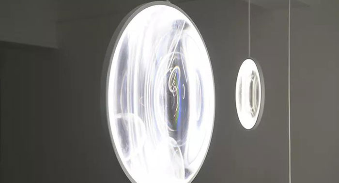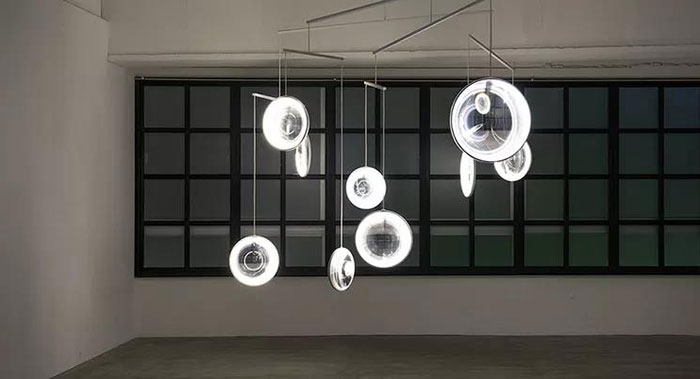 在重力的微妙作用下,裝置隨著周圍的氣流變化發(fā)生輕微的搖擺和轉(zhuǎn)動,呈現(xiàn)出多樣化的姿態(tài)。當夜幕降臨或者背景光過于微弱時,鑲嵌在鏡面邊緣的照明設(shè)備將點亮框中的場景,由此產(chǎn)生的燈光效果將使觀察者的目光集中在鏡面之外的另一個世界。