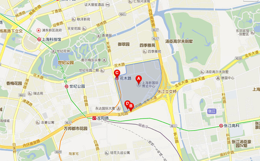 地鐵:乘2號(hào)線至龍陽路站下,步行或換乘7號(hào)線至SNIEC;約50分鐘;車費(fèi)6元。