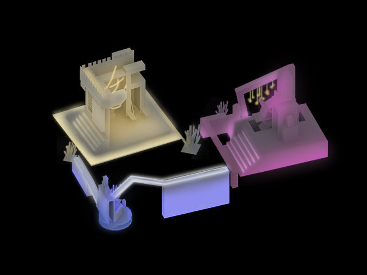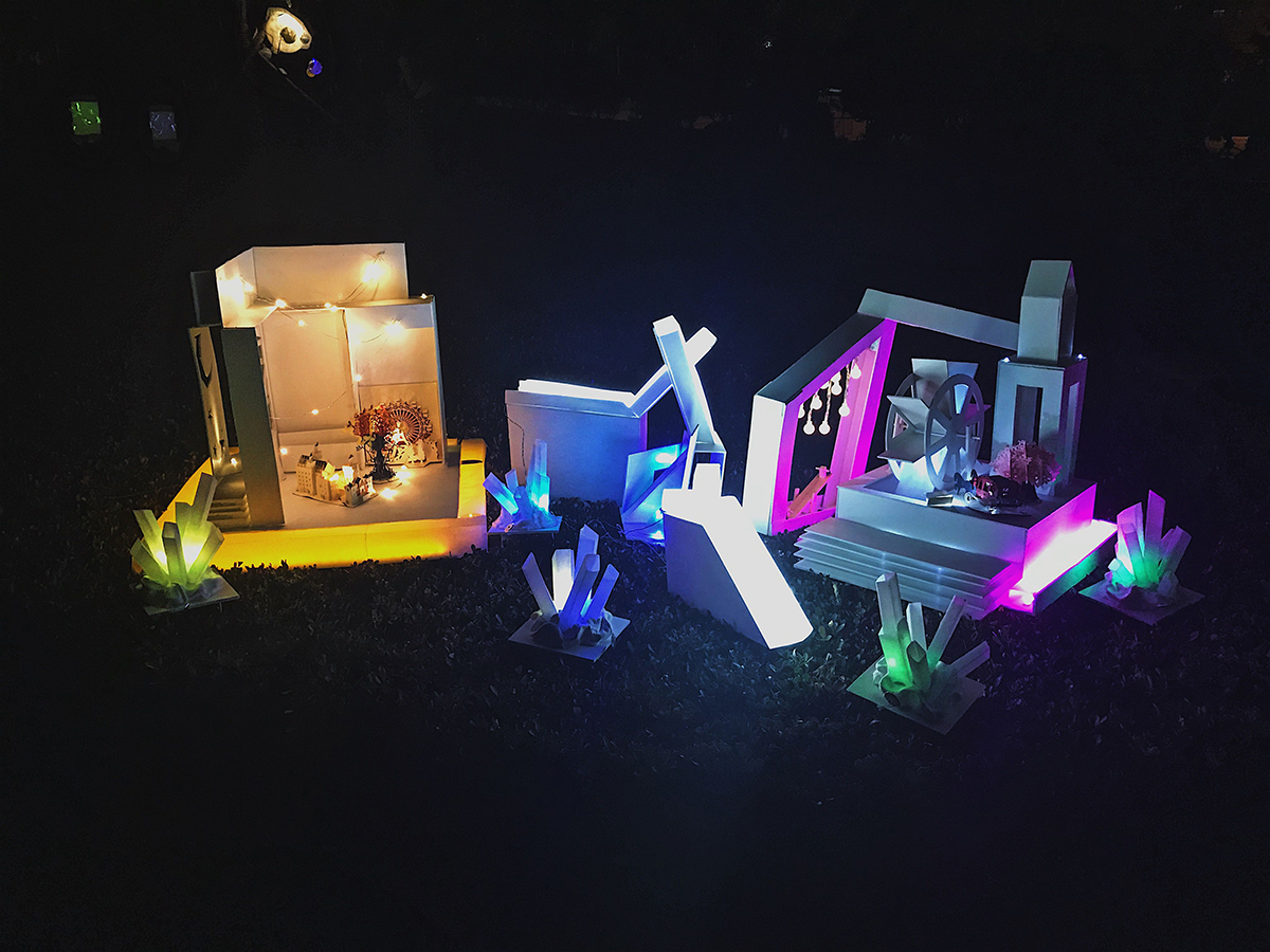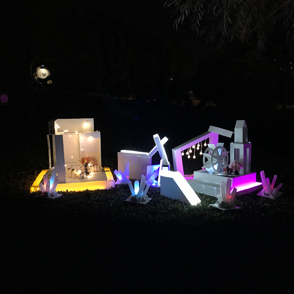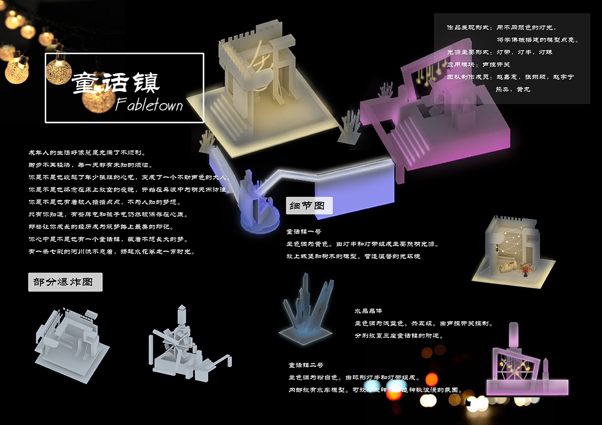 一座童話鎮(zhèn),由三座城堡相互連接,通過電路和機關設置點亮整組城堡。利用類似旋轉,拼接的機關,通過一條道路鏈接三座城,道路需全部連接在一起才能點亮。 城堡用白色的雪佛板搭建而成,分別用黃,藍,粉色led燈帶打亮,連接道用白色燈帶,再用暖白色燈珠加以裝飾。三座城堡分別象征權利富貴,溫馨浪漫,自由隨性,寓意每個人都有不同的追求,無論選擇了哪條路,堅持走下去,都會擁有一個多彩的人生。
