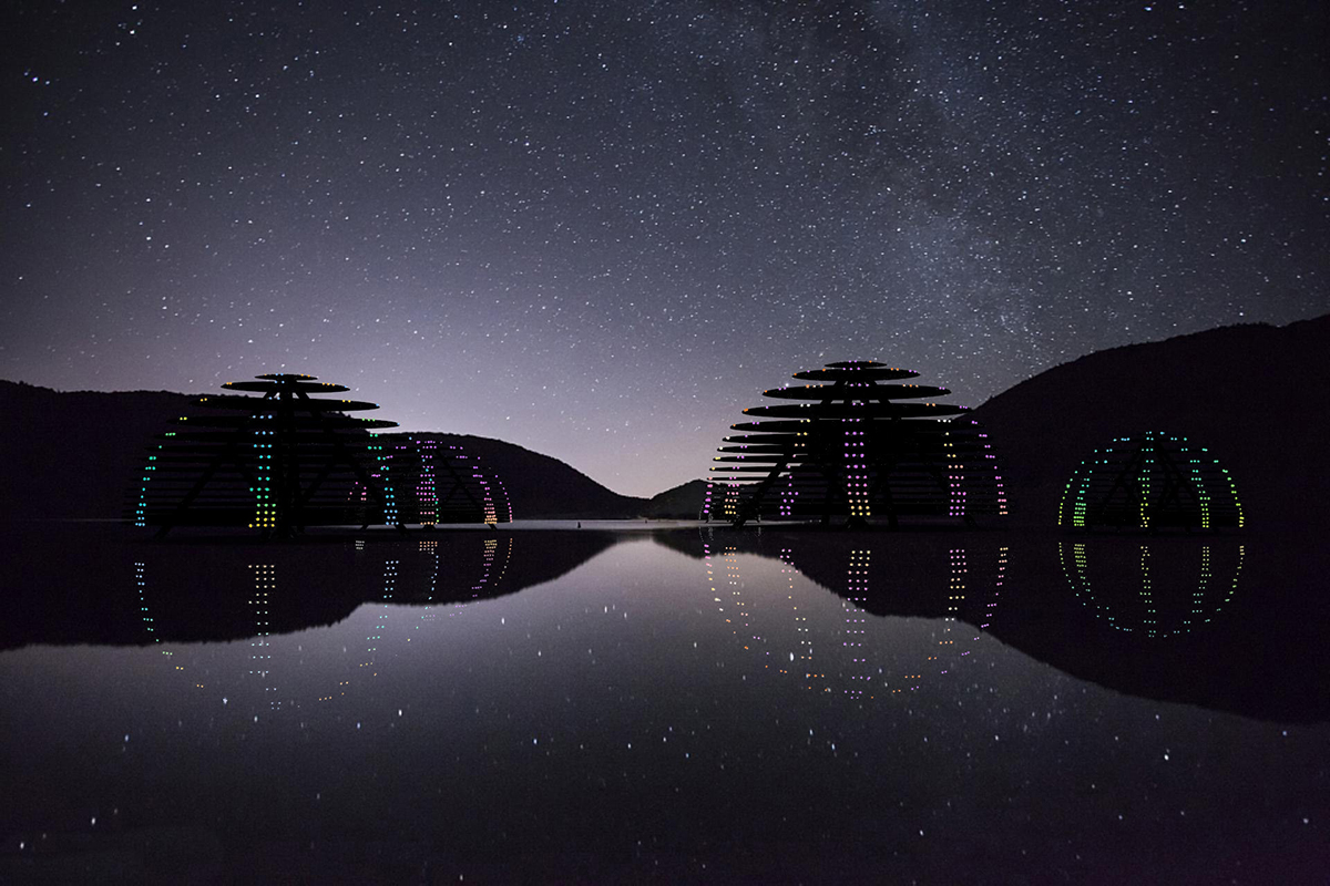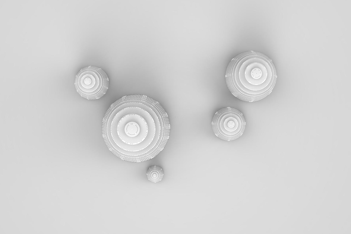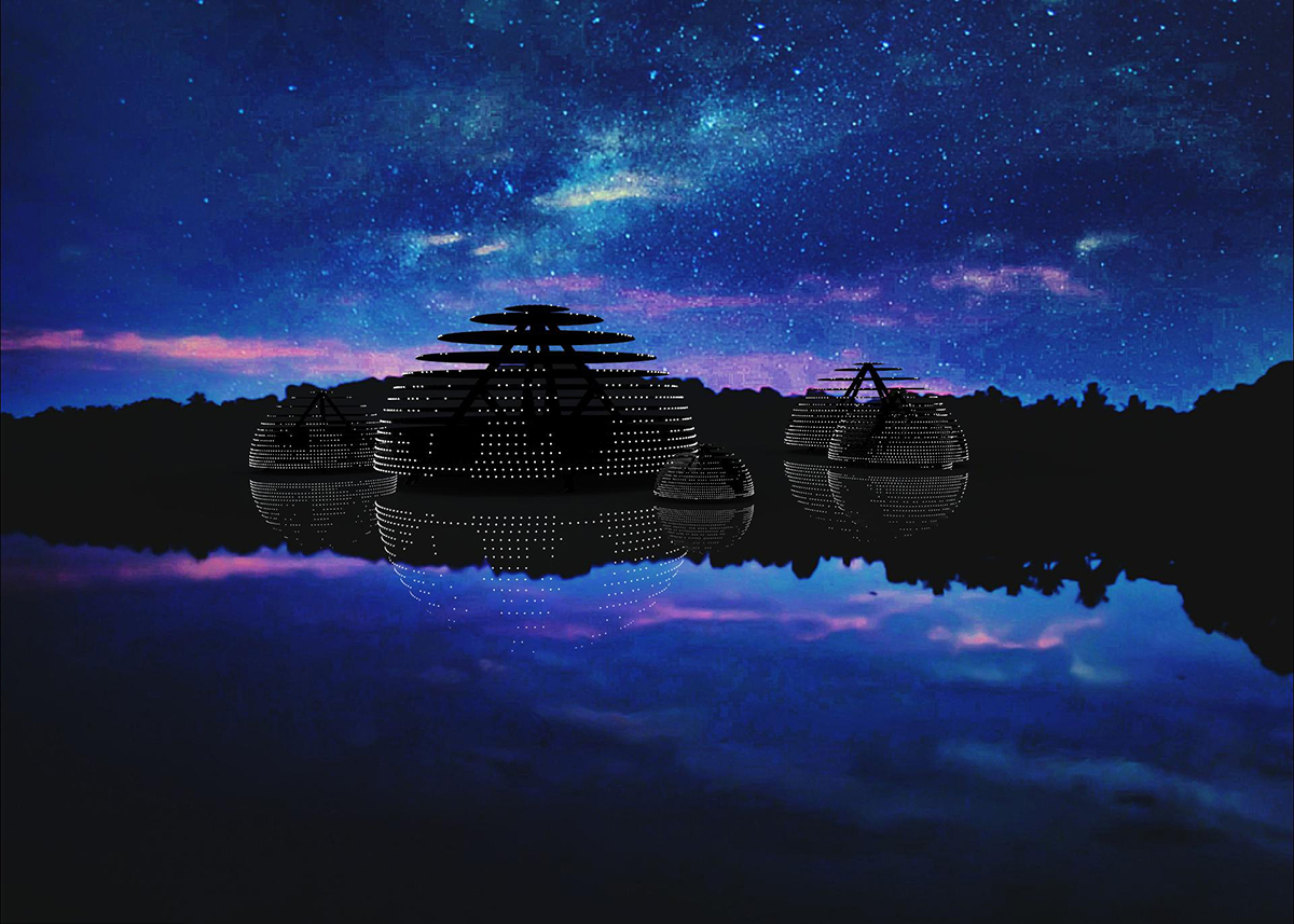 這是一款景觀燈。燈具放置在有水面的地方,和倒影相映為一個(gè)球體。圓盤側(cè)邊裝一顆顆連續(xù)的點(diǎn)光源,通過燈光編程控制燈光效果。燈光可變換光彩和影像。 白色散點(diǎn)光模式,相互映射,體現(xiàn)出祥和平靜的氛圍。仿佛遨游星空,看到宇宙中漂浮的星球。讓人冥思宇宙、自然。 彩色徑向光變化,仿生于深海發(fā)光櫛水母,變幻莫測(cè)的燈光,就像會(huì)呼吸的生物體,帶來神秘的體驗(yàn),仿佛遨游深海。 該組景觀燈錯(cuò)落有致,各個(gè)角度觀感均不相同,給人以樂趣和新鮮感。