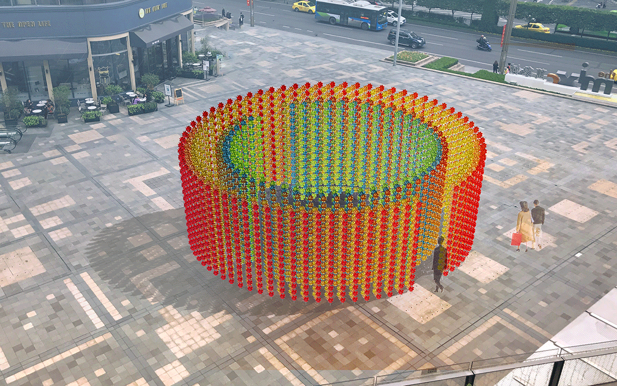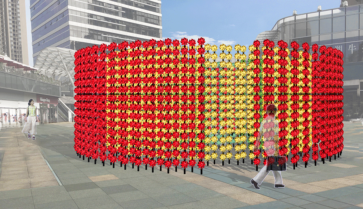 作品以風(fēng)車為元素,通過不斷地復(fù)制疊加形成了兩個(gè)圓形結(jié)構(gòu)體。風(fēng),客觀存在于宇宙,但卻又看不見摸不著,只能感受。我們想以風(fēng)車為媒介,營造出一種人、風(fēng)、場三者間的互動(dòng)。當(dāng)人經(jīng)過,風(fēng)車便會轉(zhuǎn)動(dòng)起來,風(fēng)車轉(zhuǎn)動(dòng),然又會發(fā)出“呼呼”的聲音,這就是風(fēng)呼吸的聲音。轉(zhuǎn)動(dòng)的風(fēng)車象征著生命富于活力,流轉(zhuǎn)不息, 這種視聽覺空間體驗(yàn)給人帶來無限的遐想和憧憬。
