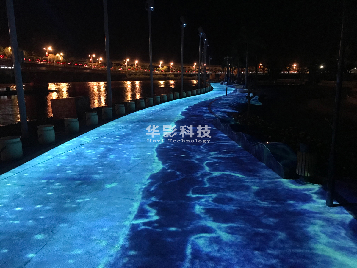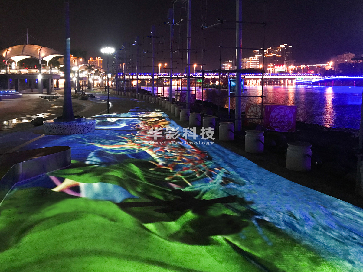 音樂和音效的配合下,地面上陸續(xù)播放不同的影片,呈現(xiàn)出波濤洶涌的海浪、繽紛花朵以及豐富的海底世界等特效。3D投影畫面設計逼真生動,給人以神奇的視覺、聲覺、感覺體驗。