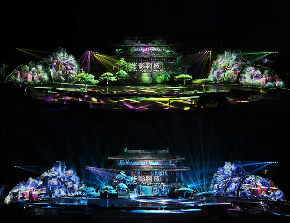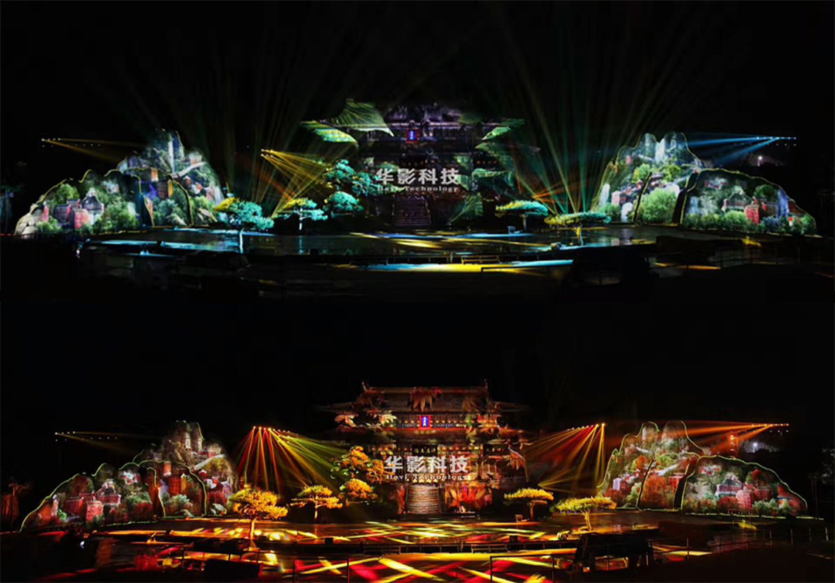 12臺20000流明投影燈、12臺8500流明投影燈、2臺16000流明投影燈融合方式投射。