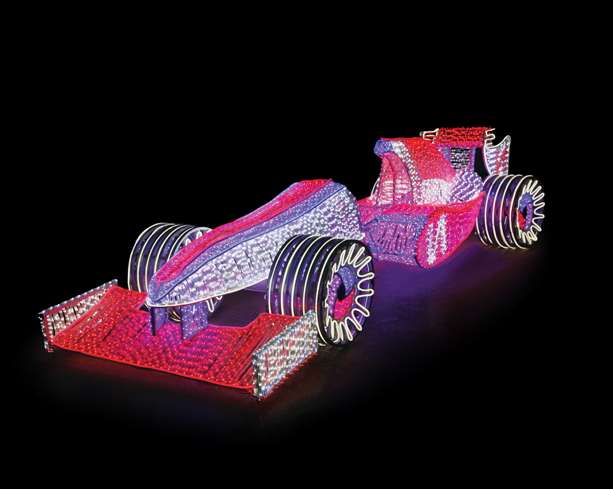 產(chǎn)品取材于F1賽車, 造型美觀,形狀逼真,四個車輪還配有特別的控制器,可產(chǎn)生旋轉(zhuǎn)的動態(tài)效果。車體采用高亮度LED燈體制作而成,防水性好,亮度高、耗電量低,節(jié)能環(huán)保。廣泛應(yīng)用于各種燈光節(jié)、公園、商業(yè)廣場、展場、酒店大堂、主題樂園等場所作為景觀造型裝飾燈飾。