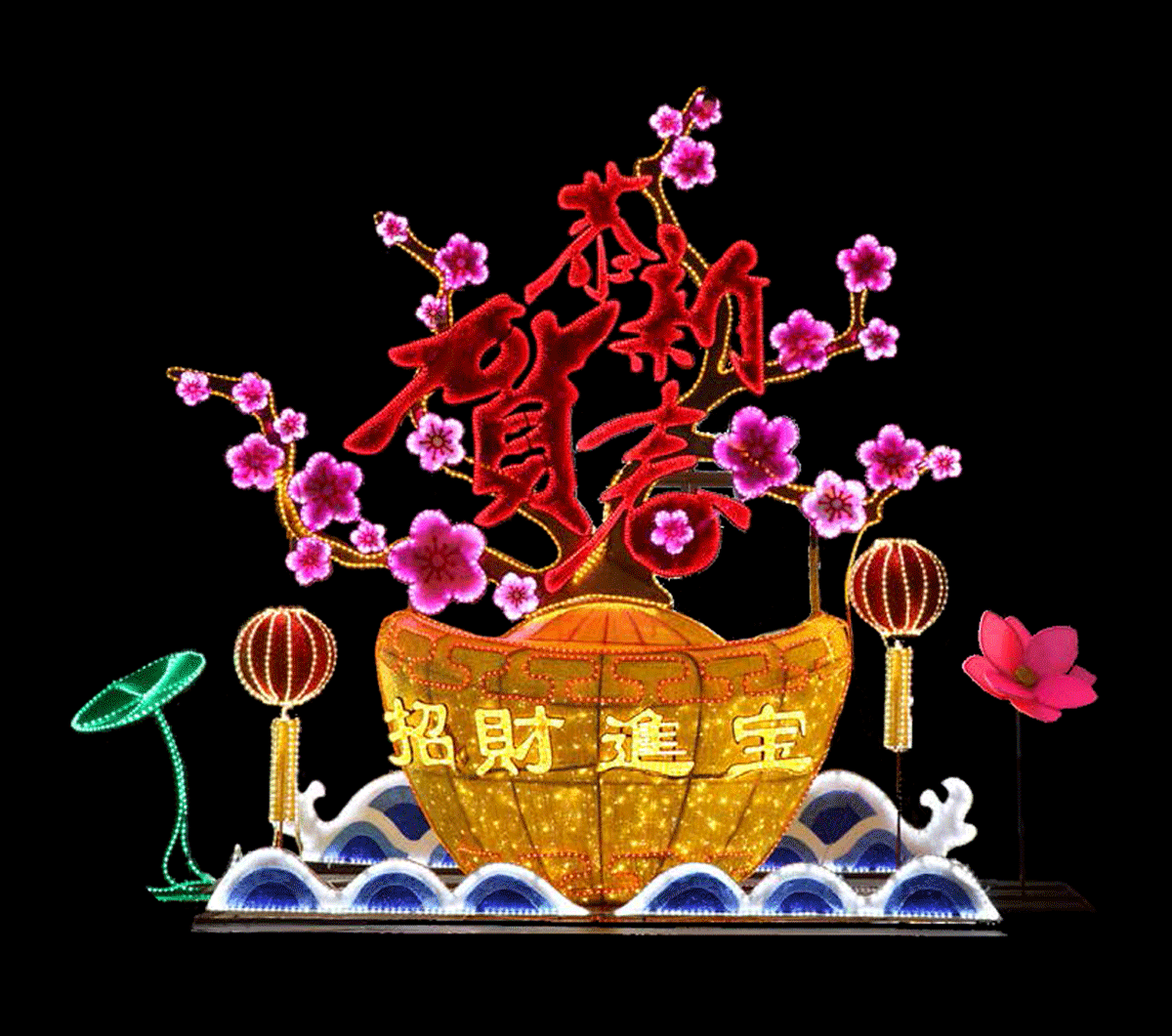 該產(chǎn)品由梅花、元寶、蓮花、燈籠等中國傳統(tǒng)元素組成,帶有濃厚的新春氣息,采用高亮度LED燈體及特殊透光布料制作而成,防水性好,亮度高、耗電量低,節(jié)能環(huán)保,是新春佳節(jié)理想的節(jié)日造型燈飾。廣泛應(yīng)用于各種燈光節(jié)、公園、商業(yè)廣場、酒店大堂等場所。