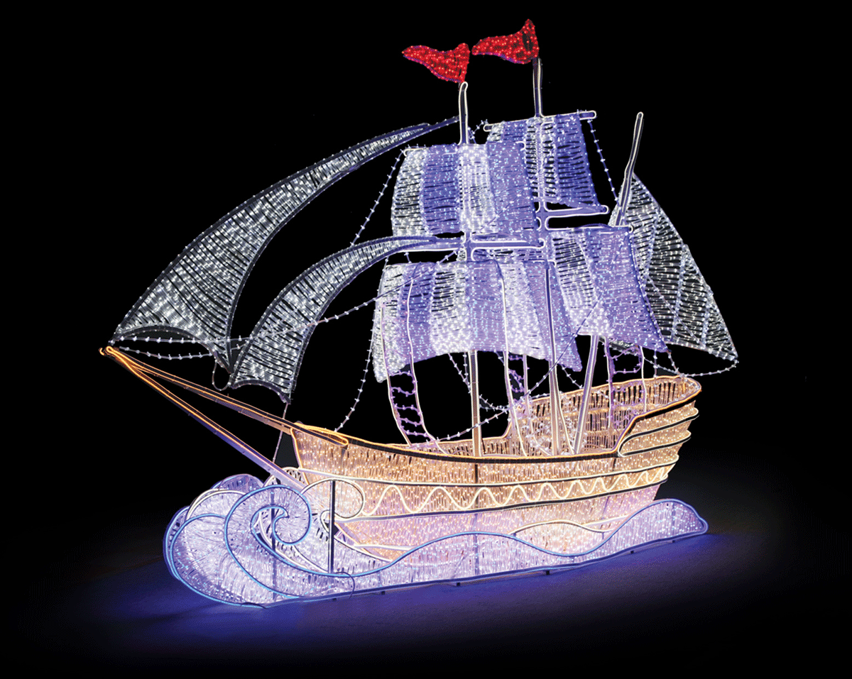 該產品外形美觀,動感強烈,所有船帆鼓風破浪前行,寓意順風順水,一帆風順。產品采用高亮度LED燈體制作而成防水性好,亮度高、耗電量低,節(jié)能環(huán)保。廣泛應用于各種燈光節(jié)、公園、商業(yè)廣場、酒店大堂等場所作為景觀造型裝飾燈飾。