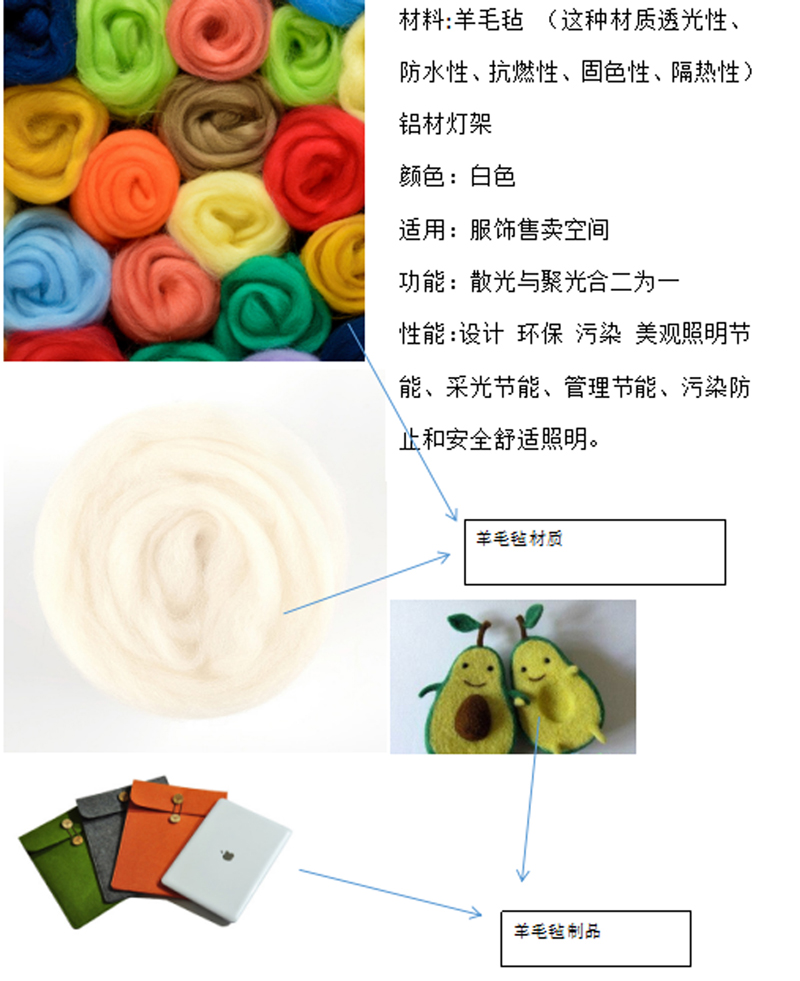 本設(shè)計為服飾售賣空間而作,從服飾中提煉羊毛氈材質(zhì)制作為燈具的外燈罩,體現(xiàn)燈具與服飾融為一體,材質(zhì)上相互呼應(yīng)。燈具本身是個不規(guī)則的形狀,提高了往常售賣空間燈具的裝飾感。報廢的燈具又可以做成裝飾品,羊毛氈是不會受損的材質(zhì),卸下燈具又是一個很好的做裝飾品的材料。 燈具采用LED光源,光源可靠性強發(fā)熱量低,無熱輻射性,使用壽命長,體現(xiàn)了燈具的可持續(xù)性。燈具本身是個散光光源,具有照亮空間的作用,這個是基礎(chǔ)照明,突出的射燈又是一個聚光光源,可直射在物體上使其成為焦點,這個是重點照明。從亮度上講,重點照明是基礎(chǔ)照明的3-6倍。優(yōu)質(zhì)的照明能夠激發(fā)情緒和感覺,進而加強商店的品牌。