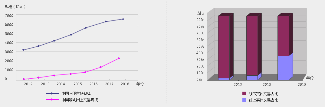 2013年,中國網(wǎng)絡(luò)購物市場規(guī)模約1.85萬億元,在社會零售總額中占比7.8%。保守估計在2017年超4萬億元。(該數(shù)據(jù)僅統(tǒng)計B2C和C2C的交易量)2013年中國照明市場規(guī)模約為3600億元,電商交易占比4.1%,約147.6億元;預(yù)計2018年中國照明市場規(guī)模6500億元,到2018年,網(wǎng)上交易規(guī)模增長754%,網(wǎng)上交易占比將達(dá)35%,交易金額可達(dá)2275億元。